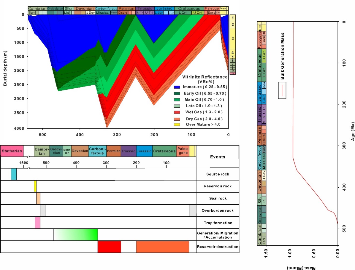 研究表明,崔庄组沉积期有机质产率较低,因此限制了黑色页岩中的有机质发育,其TOC含量相对较低。但是,深水缺氧还原环境、较高的沉积速率和良好的有机质保存条件,为崔庄组烃源岩有机质选择性富集和较高生烃产率提供了重要保障。崔庄组烃源岩在中石炭世(约327 Ma)达到最大埋深(约4000 m),热演化程度进入干气形成阶段,快速的沉降和对应的热事件在有机质热成熟方面发挥了重要作用。然而,中石炭世构造事件对油气聚体成藏具有破坏性。