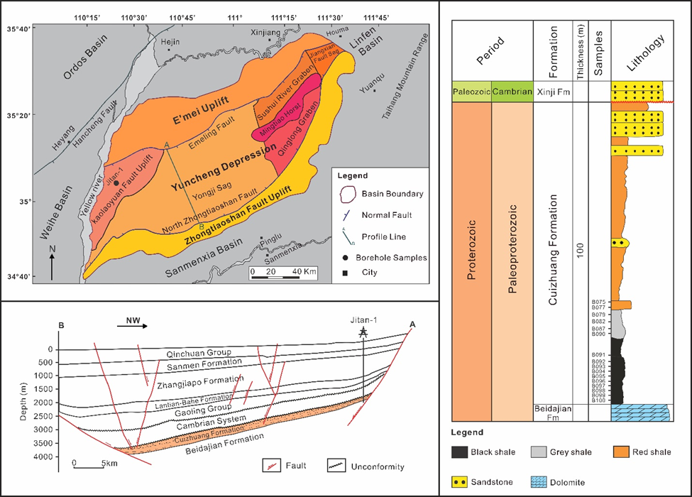 新类型、新层系是本世纪以来国际油气勘探的重要战略方向,中新元古界沉积在全球分布广,其油气形成地质条件和勘探潜力备受学术界和勘探界的关注。运城盆地是叠加在古生代华北克拉通盆地和中生代鄂尔多斯坳陷盆地之上的一个新生代断陷盆地,其周边出露的中新元古界海相沉积显示出较好的油气勘探前景,而运城盆地油气研究和勘探程度均较低,其深部油气形成条件和勘探前景不明。
