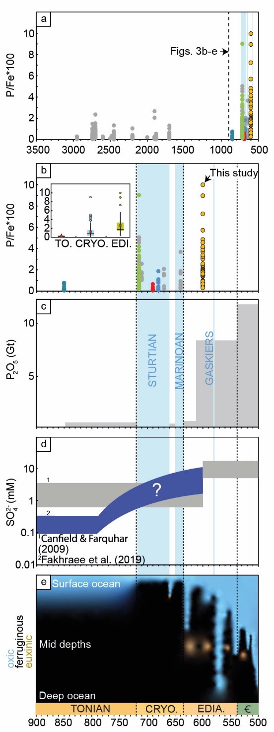 图1 a. 前寒武纪铁建造P/Fe比值;b. 新元古代铁建造P/Fe比值;c. 新元古代-寒武纪磷块岩丰度;d. 新元古代-寒武纪海洋硫酸盐浓度;e. 新元古代-寒武纪海洋氧化还原状态演化。