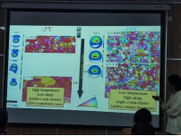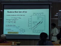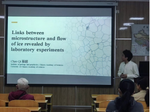 首先,綦老师首先为我们讲解了材料学中的基础知识,指出矿物冰的应变率遵循其规律,受温度、压力、微观结构等方面影响;接下来綦老师主要对冰微观结构产生的影响进行了讲解,綦老师通过自然冰川形成模拟实验对Glen flow law中n值提出了新认识,綦老师还通过对冰晶体优选方向的研究,提出在自然冰川变形过程中,随着温度由高至低、压力由小至大,应变由小至大,冰川变形机制逐渐由以双轴聚集为特征的晶界迁移向以单轴聚集为特征的晶界转动转变;最后綦老师还介绍了下一步的工作方向以及对未来研究的展望。