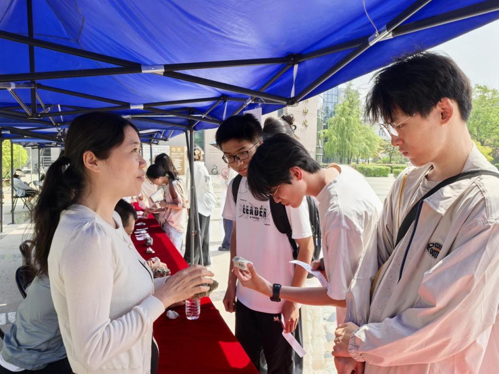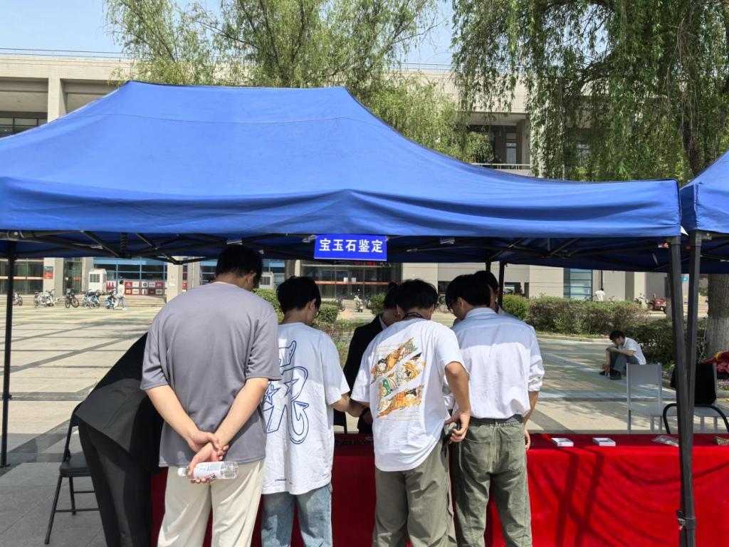 在地质标本鉴定和宝玉石鉴赏展区,梁婷、谢星和志愿者等为参观者讲解了岩石矿物、宝玉石的形成过程、结构特征和鉴别方法。