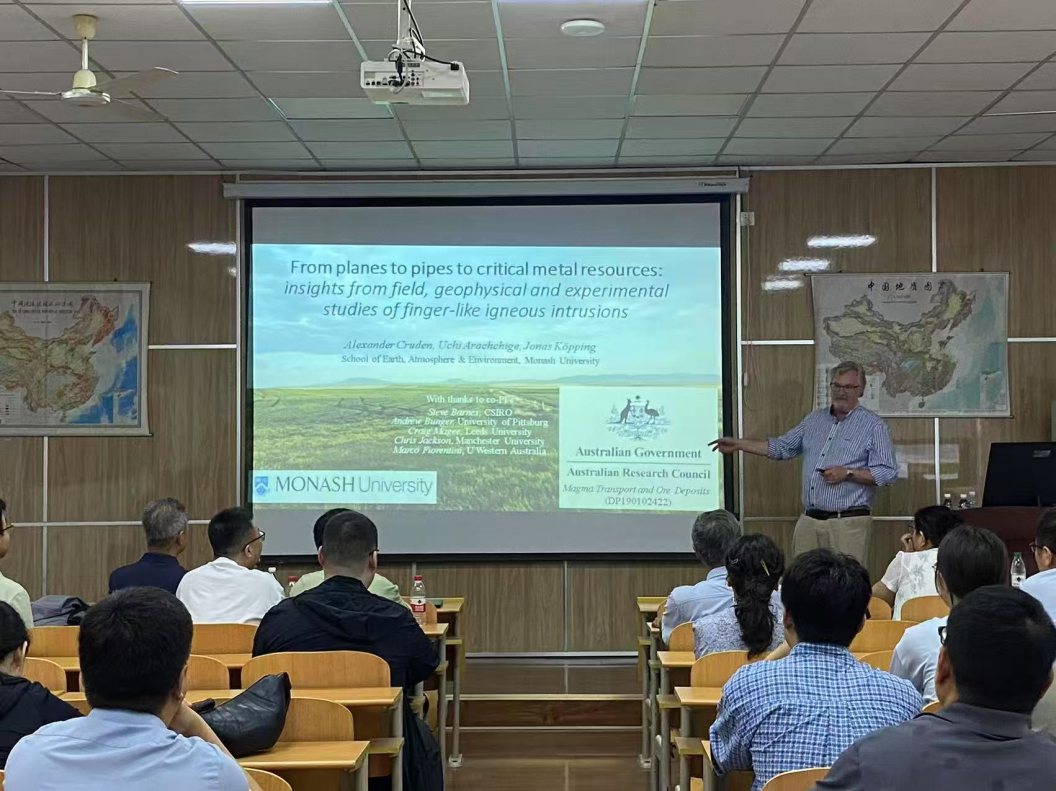Cruden教授主要从事构造与地球动力学研究,近年来将研究范围拓展至岩浆通道过程与铜镍硫化物成矿关系的探究,深入剖析成矿的物理机制。本次报告从野外观察、地球物理资料、实验研究等方面系统介绍“指状”侵入体成因,为关键金属成矿提供指示;宋谢炎研究员作为幔源岩浆作用及矿床成因研究领域的资深专家,本次报告从岩浆硫化物成矿的研究现状、有利的成矿背景及成矿的物理、化学过程等方面做了精彩报告。