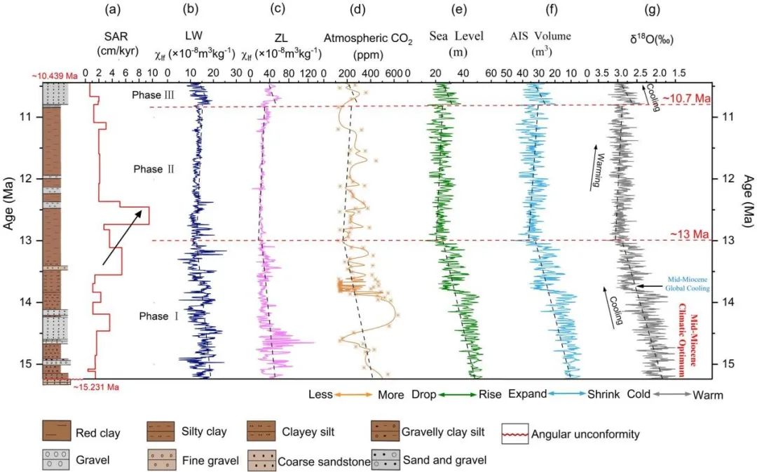 针对上述问题,365英国上市公司集团地球科学与365英国上市公司符超峰教授团队,联合中国科公司地球环境研究所强小科研究员和宋友桂研究员,湖北师范大学张蕊讲师,以尖扎盆地(15.231–10.439 Ma)发育的一套连续的风成红粘土沉积物(厚度为89.1 m)为研究对象,基于磁性地层学,锆石U-Ph定年和旋回地层学等方法,并整合青藏高原东北缘邻近盆地和全球气候变化的典型气候记录,揭示了中-中新世东亚夏季风在轨道和构造尺度上的变化及驱动机制。为阐明青藏高原抬升和东亚季风之间的联系,以及在全球气候变化下驱动东亚季风演变提供了重要的参考意义。研究结果表明,(1)尖扎盆地89.1 m厚的浪哇剖面开展磁性地层学和旋回地层学研究,建立了15.231至10.439 Ma的高精度天文年代标尺(2)东亚夏季风在15.231–10.439 Ma期间的演化划分为三个阶段:15.231–13 Ma间快速减弱期、13.0–10.7Ma间相对稳定但略有增强期、以及10.7–10.439 Ma间显著减弱期;(3)碎屑锆石U–Pb物源示踪与基于磁性地层学的沉积速率分析揭示了14.08-10.2 Ma间研究区物源变化,这归因于西秦岭山脉在13-12 Ma期间的快速隆升及其对青藏高原隆升的远程响应;(4)LW剖面的沉积速率分析证实,在盆地边缘斜坡带(临界坡度2°–3°范围内),风成沉积速率显著超过河流沉积速率,这种"弱河相-强风相"模式受双重机制驱动:坡度限制河流沉积作用,基岩-风积耦合增强沉积物捕获;(5)在轨道时间尺度上,频率磁化率记录显示出显著的长偏心率周期(~405 kyr),表明偏心率调控的低纬度夏季太阳辐射与南极冰盖波动共同主导了高原东北缘的长期降水变率。