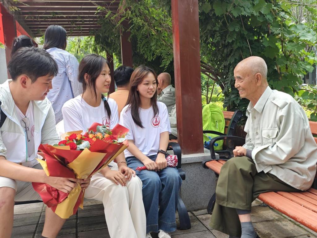 在八一敬老院,支部成员认真聆听革命老战士的先进事迹。年逾九十的八路军爷爷精神抖擞地讲述当年的革命故事;聊起往昔的革命故事,他们眼中充满着自豪。聊到兴起时,他们与大家齐唱《毛主席的战士最听党的话》。